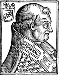 Description: Stephen IX, pope of the Roman Catholic Church (r. 1057-1058). He wears a pallium while to the left is a coat of arms with the papal triple tiara above.