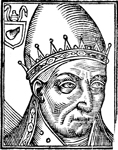 Description: Alexander II, pope of the Roman Catholic Church (r. 1061-1073). He wears a crown while to the left is a coat of arms with the papal triple tiara above.