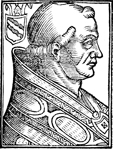 Description: Gelasius II, pope of the Roman Catholic Church (r. 1118-1119). He wears a pallium while to the left is a coat of arms with the papal triple tiara above.