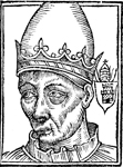 Description: An image oflestine II, pope of the Roman Catholic Church (r. 1143-1144). He wears a crown while to the right is a coat of arms with the papal triple tiara above.