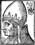 Description: Gregory IX, pope of the Roman Catholic Church and bishop of Rome (r. 1227-1241). He wears a pallium and crown; to the right is Gregory’s coat of arms with the papal triple tiara above.