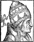 Description: Blessed Urban V, pope of the Roman Catholic Church and bishop of Rome (r. 1362-1370). He wears a pallium and the papal triple tiara; to the left is Urban’s coat of arms with the papal triple tiara above and the crossed keys of the kingdom of heaven behind.