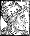 Description: Innocent VII, pope of the Roman Catholic Church and bishop of Rome (r. 1404-1406). He wears the papal triple tiara; to the right is Innocent’s coat of arms with the papal triple tiara above.
