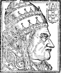 Description: Pius II, pope of the Roman Catholic Church and bishop of Rome (r. 1458-1464). He wears a pallium and the papal triple tiara; to the right is Pius’ coat of arms with the papal triple tiara above.