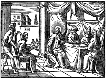 Description: Jesus heals a man with dropsy while eating dinner at a Pharisee's house on the Sabbath; outside, an ox is removed from a pit.
