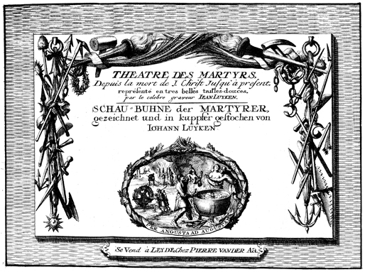Description: This historiated title-page border features various instruments of torture, Jesus’ crown of thorns among them. The inclusion of the crown alludes to the theological significance that the author accords the martyrdoms recorded in this volume. In the inset at the bottom-half of the image, Christians undergo various forms of torture at the hands of their persecutors. The Latin motto at the bottom of the inset means, “Through difficulties to honors” .