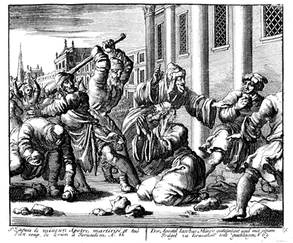 Description: A depiction of a mob beating the Apostle James the Lesser to death outside the Temple in Jerusalem.