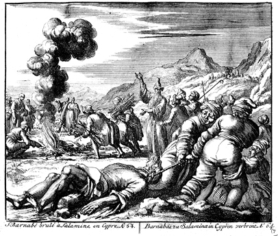 Description: A depiction of the martyrdom of Barnabas, in which he is dragged by a mob towards a fire on which he is burned. Barnabas is shown with a rope around his neck in the foreground and in the background, several people add bundles of wood to the fire.