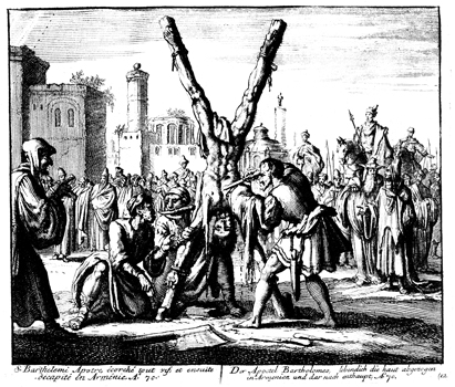 Description: A depiction of the Apostle Bartholomew being crucified upside down and flayed alive in Albanopolis in Armenia. Behind Bartholomew, a crowd has gathered to watch.