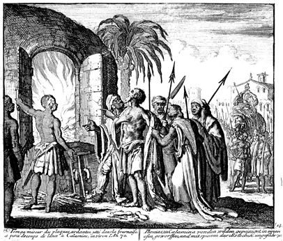Description: Upon arriving in Calamina, a city in India, the Apostle Thomas manages to destroy the idol worshipped by the citizens of that city. Upon learning of this, the local priest accuses Thomas to the king, who then has Thomas thrown into a fiery furnace. The spears held by the priests are the instruments that they used to kill Thomas, as he remained untouched by the flames.