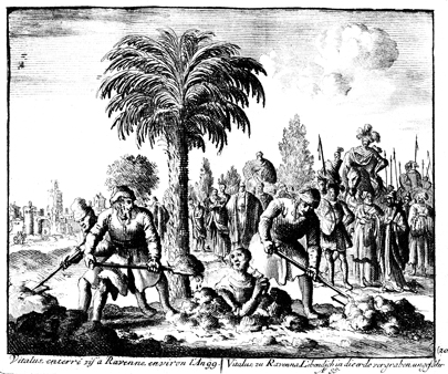 Description: The consul Paulinus has Vitalis buried alive in Ravenna for his confession of faith in Jesus.