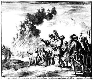 Description: In the background fourteen Christian are burned alive at Orleans after being accused of heresy by officials of the Roman Catholic Church. In the foreground, the most prominent of these Christians, Stephen, raises his hands to heaven .