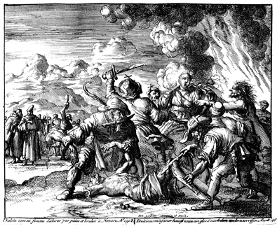 Description: A man named Dulcinus and his wife, Margaret, are torn limb from limb after being branded arch-heretics for espousing the beliefs of the Waldensians.