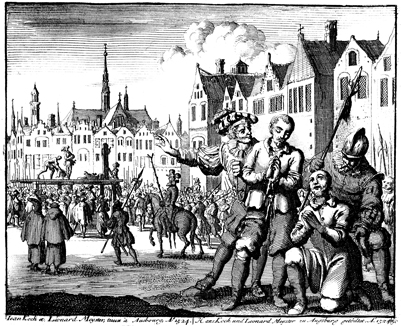 Description: Hans Koch and Leonard Meister pray fervently to God shortly before officials of the Roman Catholic Church have them put to death in Augsburg for espousing beliefs similar to those of the Waldensians.