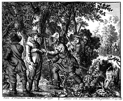 Description: Having been betrayed by one whom they considered a fellow believer, Hans van Overdam and Hansken Keeskooper are apprehended by the authorities of Ghent in the woods near that town. The cause for their arrest was an impassioned letter van Overdam sent to the authorities which severely reproached them for compelling some his fellow believers to renounce their Anabaptist faith .
