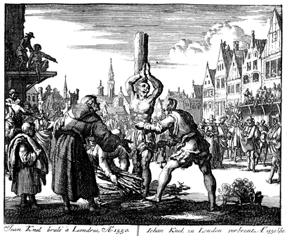 Description: Men prepare to burn John Knel to death in London, where he had been imprisoned, for confessing beliefs similar to those of the early Anabaptists.