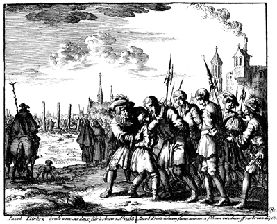 Description: Having evaded capture in Utrecht only to be captured in Antwerp, Jacob Dircks and two of his sons, Andries Jacobs and Jan Jacobs, are sentenced to death by the authorities of Antwerp for their Anabaptist faith. As Dircks and his sons make their way to their execution, Dircks’ youngest son, Pieter Jacobs, throws his arms around his father’s neck, but the guards tear him way and toss him underneath the feet of the mob to be trampled to death .