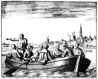 Description: A boatman by trade, Pieter Pieters Beckjen takes the gathering of oppressed Christians of which he is member onto the open water off the shore of Amsterdam so that they can edify one another without fear of that city’s authorities.