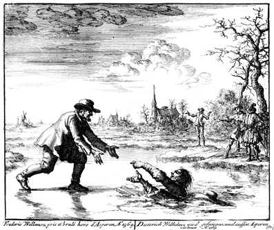 Description: Dirk Willems evades capture in Asperan only to turn back to save the life of his pursuer, who has fallen through the ice of a frozen pond. Nevertheless, instead of releasing Willems for this favor, his pursuer arrests him and takes him back to Asperan, where the authorities of that city have Willems tortured and finally burned to death for his Anabaptist faith .