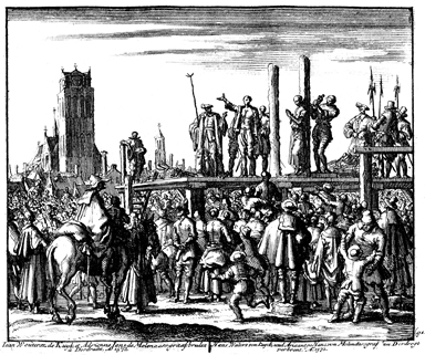 Description: In 1572 C.E., the judicial authorities of Dortrecht arrest both Adriaenken Jans of Molenaersgraef and Jan Woutersz van Kuyck for their Anabaptist faith and imprison them in the Vuylpoort, where they are severely tortured. Despite their sufferings, they refuse to renounce their faith, and the authorities have them sentenced to be burned to death as a consequence, though they have given express orders to have Adriaenken Jans strangled to death before they burn her body. Just prior to their execution, Jan Woutersz manages to deliver a prayer before the crowd that has gathered to witness the vulgar spectacle .