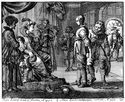 Description: Hans Knevel, a Dutch Anabaptist, stands bound with ropes before the margrave of Antwerp, who orders him to account for his faith, as Anabaptism was outlawed at that time.