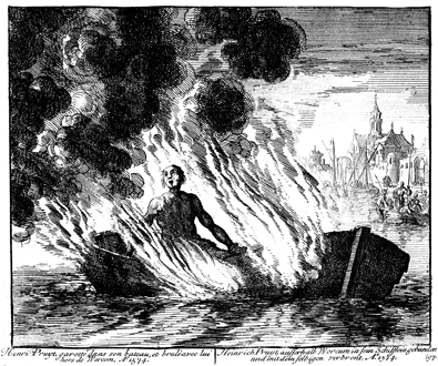 Description: During the Eighty Years’ War, Spanish soldiers board the boat of the Mennonite Hendrick Pruyt off the coast of Friesland, confiscate his vessel, and imprison him at Wurckom, in Friesland. Upon learning of his Anabaptist faith, they torture him and endeavor to put him to death by binding him to a dinghy covered in tar, setting said dinghy on fire, and sending him out on the Zuiderzee to perish.