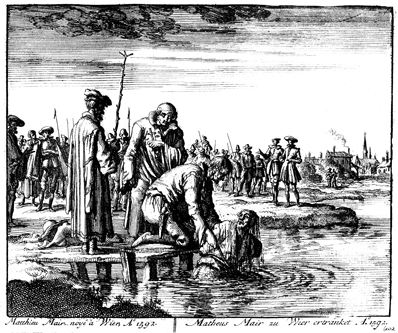 Description: A group of Roman Catholic priests in Baden have Mattheus Wier arrested and sentenced to death by drowning for his Anabaptist faith. After the executioner first thrusts Wier into the water, he draws him out three or four times in order to give him opportunities to recant, but Wier resolutely refuses to do so each time.