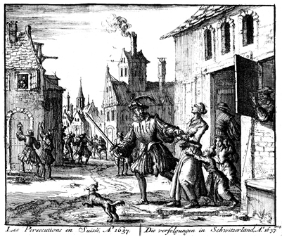 Description: In 1637 C.E., civil authorities throughout Switzerland send out their deputies to arrest as many suspected Anabaptists as possible, Catharina Mulerin (foreground) among them. Beyond all expectation, the Zurich authorities finally release Mulerin after forcing her to endure sundry tortures .