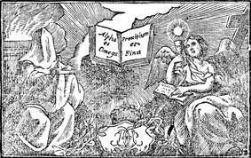 Description: The printer’s Device of Jean-Baptiste Coignard (d. 1735) features an open book, reading “Alpha et Omega” (Alpha and Omega) and “Principium et Finis” (Beginning and end) and the printer’s monogram (base) and is flanked by a hooded figure (left) and an angel with the eucharistic elements.
