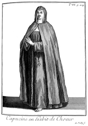 Description: A Franciscan nun in the Capuchin order, shown here in choir robes. Engraved by François de Poilly (1623-1693).
