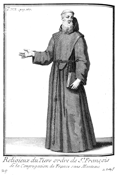 Description: A monk of the Third Order of Saint Francis of France, shown here without his mantle. Engraved by François de Poilly (1623-1693).