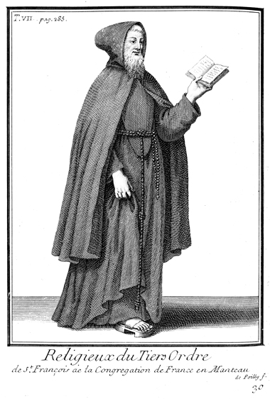 Description: A monk of the Third Order of Saint Francis in France, shown here wearing his mantle. Engraved by François de Poilly (1623-1693).