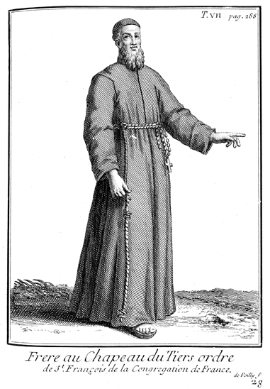 Description: A monk of the Third Order of Saint Francis in France, shown here wearing his cap. Engraved by François de Poilly (1623-1693).