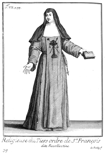 Description: A nun of the Third Order of Saint Francis, known as a Recollectine. Engraved by François de Poilly (1623-1693).
