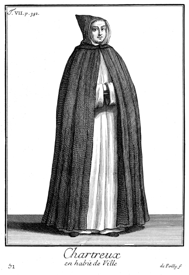 Description: A member of the Carthusian Order, or the Order of Saint Bruno, shown here in typical town clothing. Engraved by François de Poilly (1623-1693).