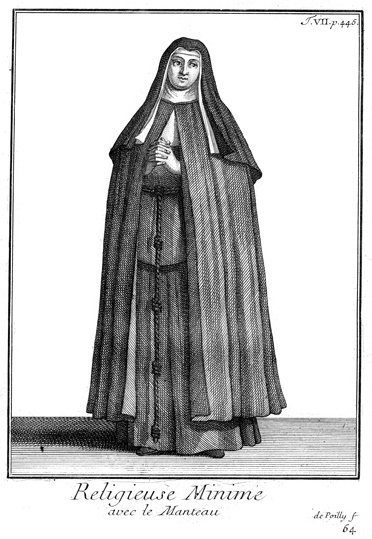 Description: A member of the Order of the Minims, shown here with her mantle. Engraved by François de Poilly (1623-1693).
