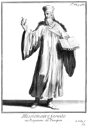 Description: A missionary of the Society of Jesus, a religious order founded in 1534 by Saint Ignatius of Loyola. This Jesuit is a missionary to the Tonkin Kingdom. Engraved by François de Poilly (1623-1693).