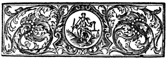 Description: This historiated headpiece features vines surrounding an image of Lady Justice holding a sword and scale.