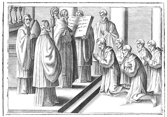 Description: This engraving is the last of five illustrating the reconciliation of penitents to the Church on Holy Thursday. The bishop prays over the penitents.