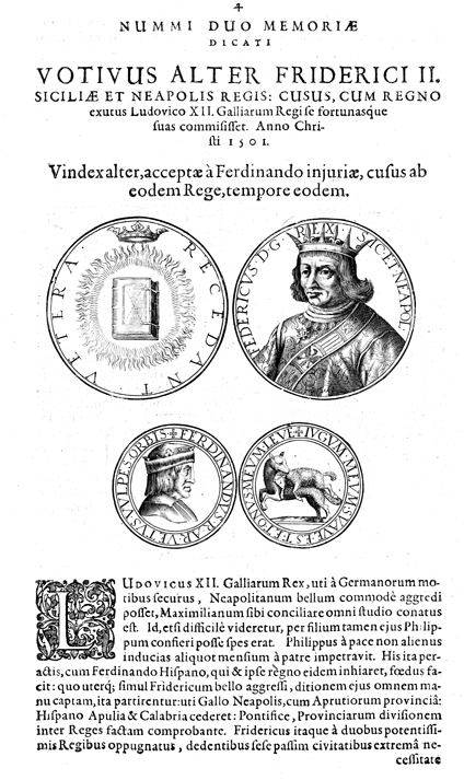 Description: A depiction of two coins. The top coin has a portrait of King Frederick on one side and a book within a sunburst on the other. The bottom coin has a profile of King Ferdinand on one side and a wolf hunting a lamb on the other.
