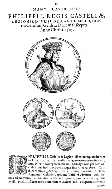 Description: A depiction of coins with the profile of King Phillip, a knight on horseback, Saint Paul, and scrollwork.
