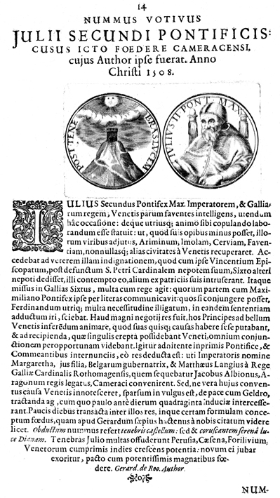 Description: A depiction of a coin with Pope Julius II on one side and a city on a hill on the other side.