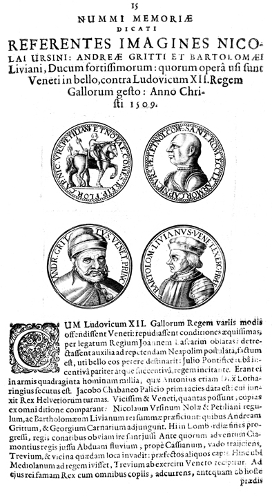 Description: Coins with a depiction of a knight on horseback on one side and a profile of a Roman Senator on the other side of the upper coin, and a portrait of a Venetian Prince on one side and a profile of King Bartholomew on the other side of the lower coin.