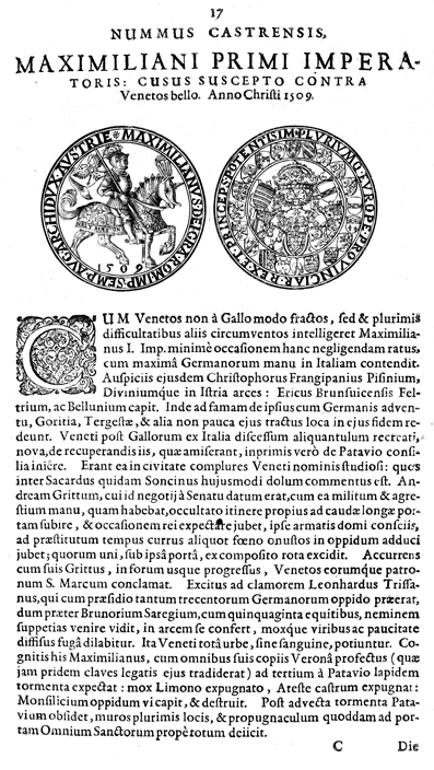 Description: A depiction of a coin with a coat of arms surrounded by other coats of arms and a knight on horseback on the other side.