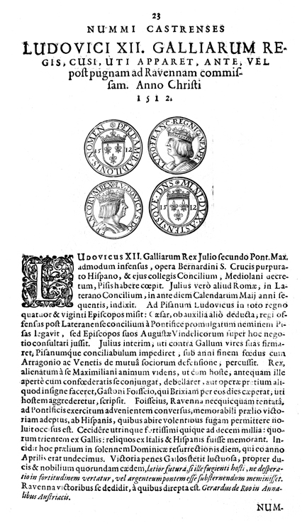 Description: A depiction of coins with a coat of arms with three fleur de lis and profiles of King Ludicus.