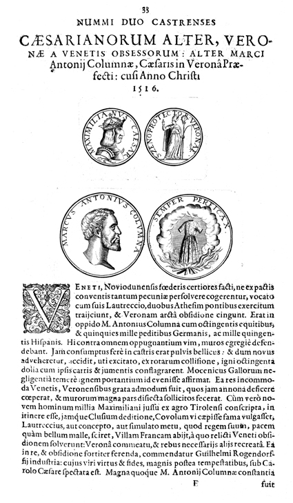 Description: A depiction of four coins. The top left coin shows a profile of King Maximillian, the right top coin shows a depiction of Athena, the lower left coin shows a profile of Marcus Antonius Columna, and the lower right coin shows an empty dress suspended above a fire.
