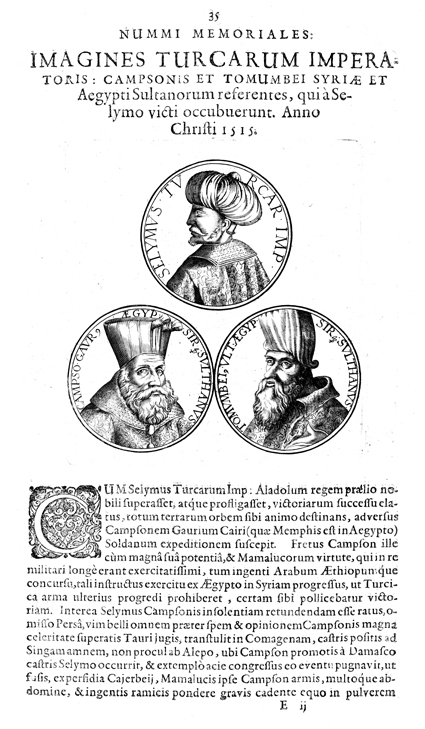 Description: A depiction of three coins. The top coin shows Emperor Seiymus Turcarum, the lower left coin shows Campsonem Gaurium Cairi, and the lower right coin shows Sulthanus of Egypt.