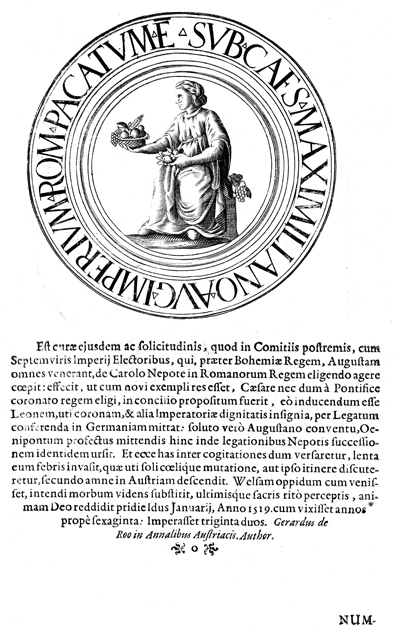 Description: A depiction of a coin embossed with a woman offering food as a symbol of peace.