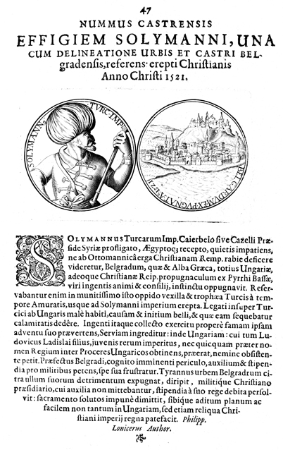 Description: A depiction of two coins, with a profile of Solymann on the left and the city of Belgardum on the right.