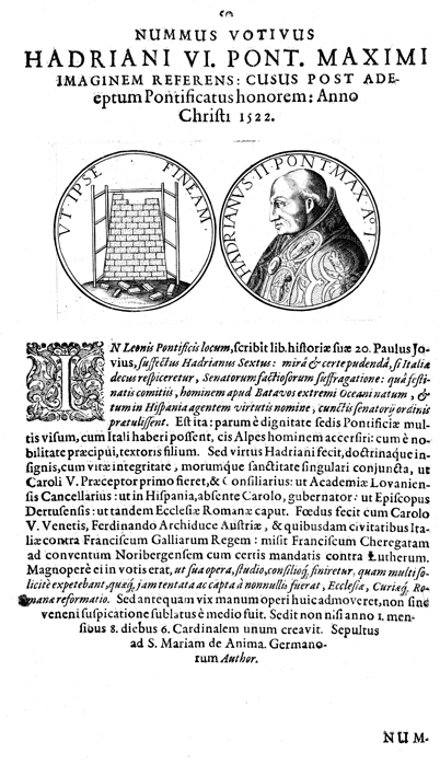 Description: A depiction of two coins, with a depiction of a wall being constructed on the left and a profile of Pope Hadrian II on the right.